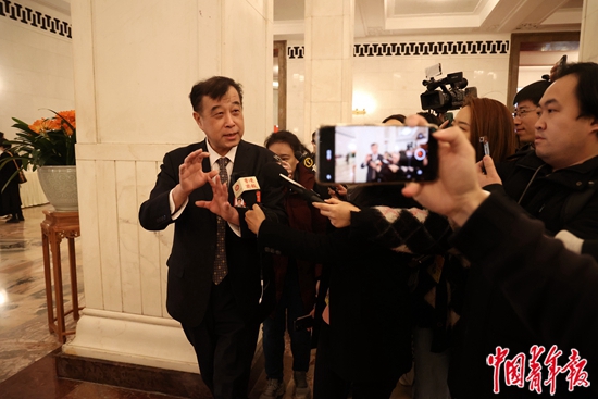 3月8日,北京人民大会堂,十四届全国人大二次会议第二次全体会议前,记者们采访全国人大代表李义虎。中青报·中青网记者 王鑫昕/摄