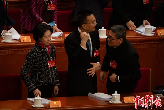 3月9日上午,北京人民大会堂,全国政协十四届二次会议第三次全体会议结束后,全国工商联副主席、信德集团有限公司行政主席兼董事总经理何超琼(左),全国政协委员、台盟中央副主席符之冠(右)和全国政协常委、全国工商联副主席张宗真互相交流。中青报·中青网记者 李峥苨/摄