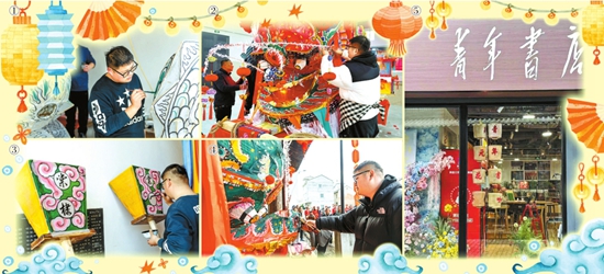 ①②③④今年寒假,浙江东阳青年左炎令采用传统工艺,手工制作20余条“原汁原味”的龙灯。⑤北京一家书店悬挂着左炎令制作的龙灯。受访者供图