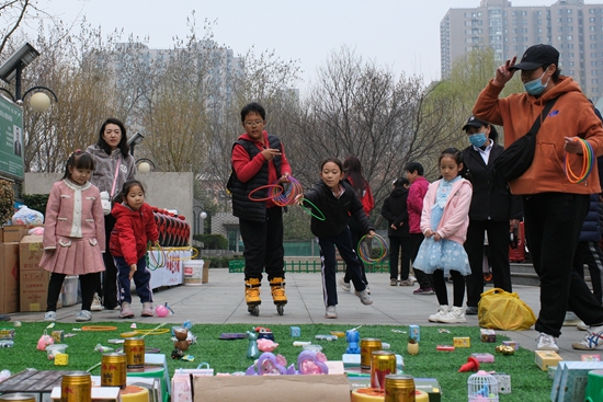 3月16日,北京市朝阳区,一场主题为“春回大地,爱满西南”的社工日主题活动在劲松街道西大望路南社区举行,参加活动的孩子们正在套圈摊位玩耍。据该社区党委书记曹明霞介绍,本次活动的特色为以物换物、旧物回收、业主跳蚤市场和精品市集,社区通过举办该活动,来丰富居民生活、宣传环保意识和垃圾分类意识。田嘉硕/摄