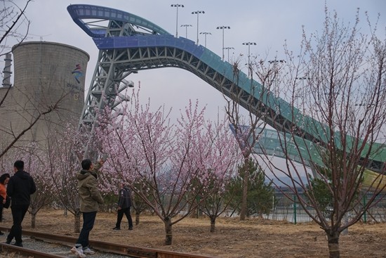 3月18日,北京首钢园,首钢滑雪大跳台下的火车公园,盛开的桃花吸引游客驻足拍照,临近春分时节,众多游客来到这里踏青赏花。田嘉硕/摄