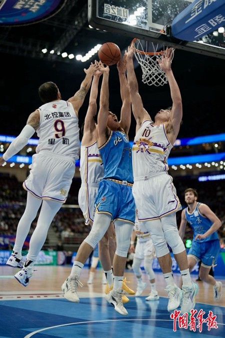 3月17日,2023-2024赛季CBA常规赛第44轮,北京首钢队主场对阵北控队,双方在篮下争抢。中青报·中青网记者 李隽辉/摄
