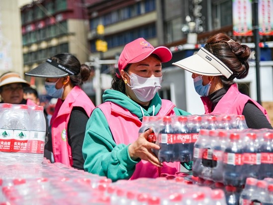 3月19日,在雅江县木雅广场,当地志愿者帮忙搬运物资。