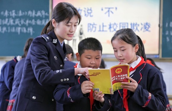 3月20日,江苏南通,海安市高新区仁桥小学,民警为小学生讲解未成年人保护法。当日,海安市公安局城西派出所开展“法治宣传进校园 普法教育护成长”活动。周强/视觉中国