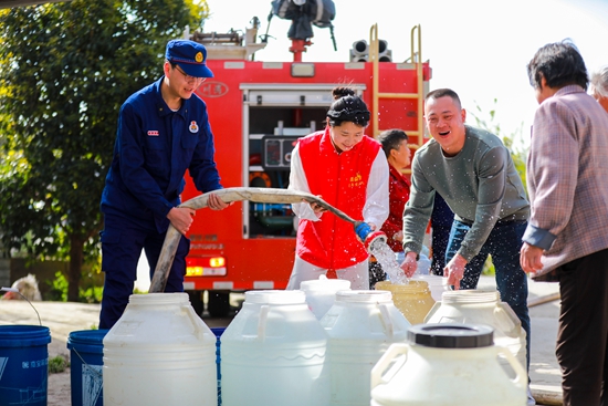 3月25日,贵州省毕节市,消防救援人员和党员志愿者在雨朵镇土城村农家院坝为村民送水。