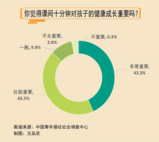 调查中,86.8%的受访家长觉得课间十分钟对孩子的健康成长重要,其中43.3%的受访家长认为非常重要。