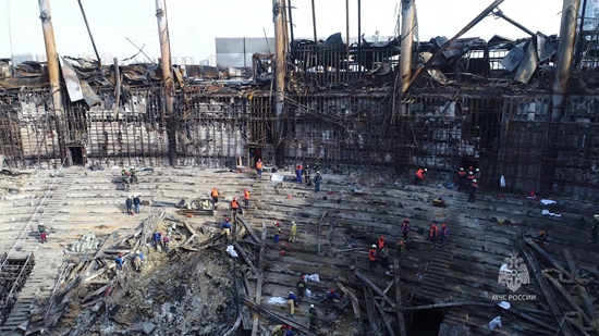 当地时间3月25日,俄罗斯莫斯科,“番红花市政厅”音乐厅在3月22日晚的恐袭中被烧毁,图为救援人员在现场清理瓦砾。视觉中国供图