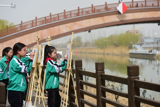3月28日,参加公益研学活动的学生在描画运河景色。当日,由河北沧州百狮园公园、沧州中西医结合医院南川老街国医堂主办的“春到运河美,传统文化润童心”公益研学活动在古运河畔举办,孩子们通过各种方式了解运河历史,感知传统文化魅力。新华社记者 范世辉/摄