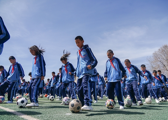 3月28日,青海省西宁市城北区在大堡子小学开展学校特色项目展示交流活动,图为学生进行足球特色大课间展示。视觉中国供图