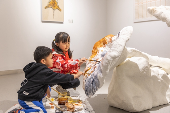 4月6日,重庆医科大学附属璧山医院(重庆市璧山区人民医院)联合重庆三合美术馆举办的“百草创艺”中医药艺术作品展在重庆市沙坪坝区丰文街道三河村正式开幕。现场,两名小观众在互动体验区用废弃的中药材萃取的颜料绘画。新华社记者 黄伟/摄