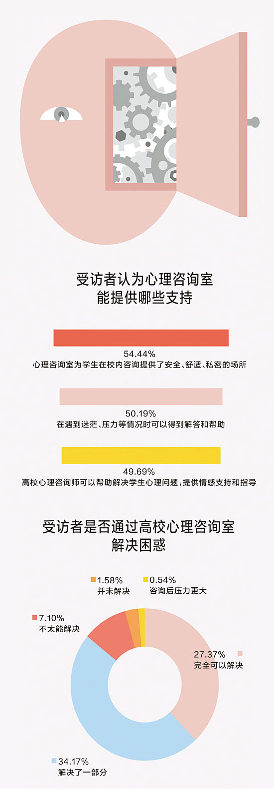 中青校媒近期调查发现,受访者通过高校心理咨询室解决困惑情况如下:完全可以解决(27.37%)、解决了一部分(34.17%)、不太能解决(7.10%)、并未解决(1.58%)、咨询后压力更大(0.54%)。54.44%的受访者表示心理咨询室为学生在校内咨询提供了安全、舒适、私密的场所;50.19%的受访者认为在遇到迷茫、压力等情况时可以得到解答和帮助;49.69%的受访者认为高校心理咨询师可以帮助解决学生心理问题,提供情感支持和指导。