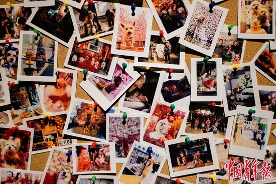 4月7日,北京世贸天阶商圈,一家宠物友好餐厅的墙上挂着人们和宠物的合影。