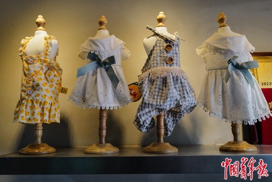 4月7日,北京百子湾商圈,一家宠物店里售卖的宠物服饰。