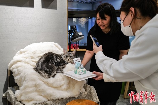 4月8日,北京三里屯一家宠物烘焙店,一名顾客拿着刚做好的宠物蛋糕,给过生日的猫咪拍照。