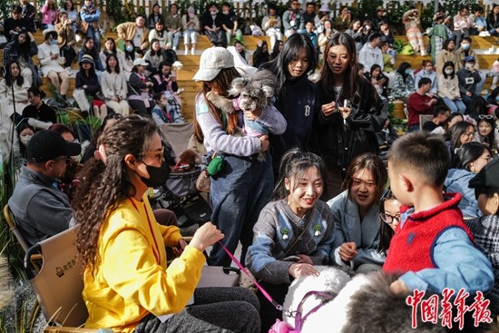 3月16日,北京,一场以小狗为主题的音乐会活动间隙,几个年轻人在摸小狗。近年来,随着喂养宠物人群的增多,宠物成为年轻人的社交主题。