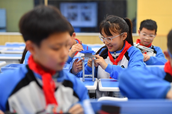 近年来,湖南省湘潭市雨湖区九华和平科大小学开发机器人、编程、无人机、机甲大师等科技特色课程,通过“科技课堂”培养学生的科学素养和动手能力,点燃孩子的“科学梦”。新华社记者 陈泽国/摄