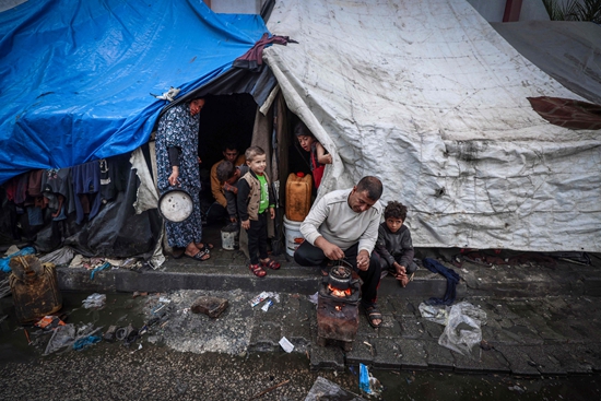 当地时间2024年4月10日,加沙地带拉法,巴以冲突仍在持续,一名流离失所的男子在街道旁的帐篷前为家人煮茶。