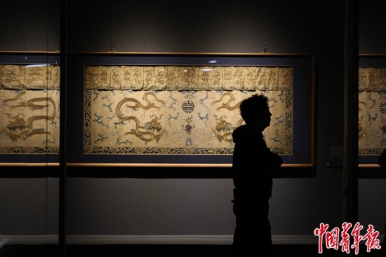 4月6日,北京市,“千人千面”民族服饰展现场,参观者从一件清代的黄地平金绣二龙戏珠纹桌帷前走过。这件桌帷以黄缎地为面,左右两侧绣有两条五爪金龙,与中间的火球纹样呈二龙戏珠的景象,寓意着福寿繁荣。该展展出我国18至19世纪的织绣、首饰、器皿共300余件,呈现当时从王公贵族到寻常百姓的服装制式和工艺。通过观看这些“穿在身上的历史”,今天的年轻人得以体味那个年代的民族文化、艺术与风情。中青报·中青网记者 孔斯琪/摄