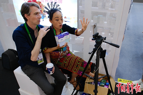 •     4月14日,海南海口,海南国际会展中心,第四届中国国际消费品博览会时尚生活消费展区,在英国国家馆门前,一名穿戴海南黎族特色服饰的女士与英国籍丈夫一起直播带货。中青报·中青网见习记者 田嘉硕/摄