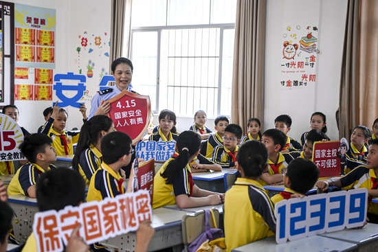 4月15日,在广西兴业县一所小学内,公安民警为学生们讲解国家安全相关知识。当日是第9个全民国家安全教育日,各地开展全民国家安全教育日宣传活动,增强全民对总体国家安全观的认识,共筑国家安全防线。新华社记者 曹祎铭/摄