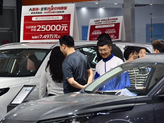 4月5日,河北省邯郸市,消费者正在永年区车展上选购“以旧换新”优惠的汽车。视觉中国供图