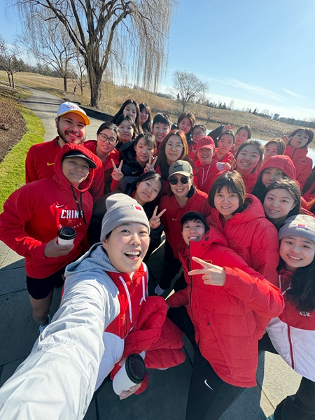 3月29日,美国尤蒂卡,2024年女冰世锦赛顶级组比赛前夕,中国女冰队员们合影。于柏巍供图