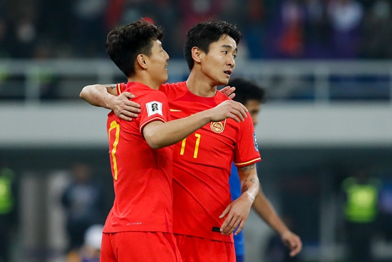 3月26日,国足在天津主场4∶1战胜新加坡队,图为武磊(左)与韦世豪庆祝进球。视觉中国供图
