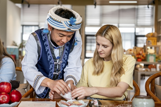 一名俄罗斯塔斯社记者(右)在大理市体验包装下关沱茶(4月13日摄)。近年来,云南省大理白族自治州以加快文旅产业深度融合为抓手,持续推出丰富多彩的文旅活动及惠民措施,不断提升旅游品质和服务质量,推动文旅市场持续升温。新华社记者 胡超/摄