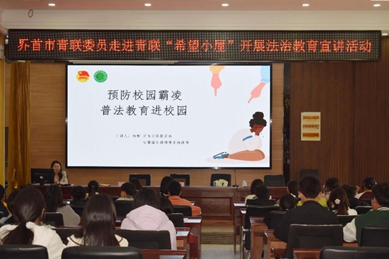 安徽省界首市青联法律界别委员近日走进“青联希望小屋”,从典型案例入手,为100余名师生开展“预防校园欺凌”主题法治宣讲,引导学生树牢法治意识和安全底线思维,不做欺凌者和被欺凌者,也不做冷漠的观望者。王佳宁/摄
