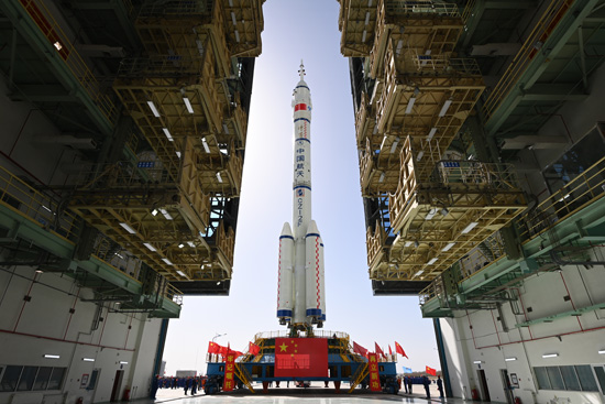 4月17日,神舟十八号载人飞船与长征二号F遥十八运载火箭组合体在垂直转运中。