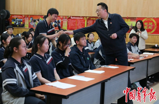 4月18日,北京市第八十中学,《中国式现代化概论》第六讲中,来自北京青年政治学院的教师徐杰(右)与学生互动交流。