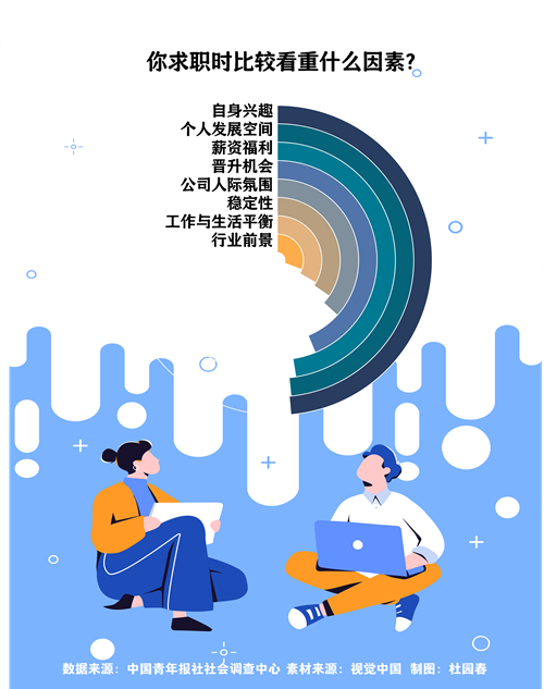 近日,中国青年报社社会调查中心联合问卷网(wenjuan.com),对1334名应届大学毕业生进行的一项调查显示,自身兴趣是受访毕业生求职最看重的因素,接下来是发展空间、薪资福利、晋升机会。