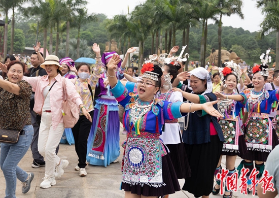 在这里,舞春牛、对山歌等特色民族互动歌舞表演引得现场一阵欢声笑语。开怀之际,围观游客突然被演职人员热情地拉上舞台,大家排成长队,将手搭在前一个人的肩上,随着音乐的节奏共跳“多耶”舞,队伍一圈圈地环绕,大家挥手欢笑……