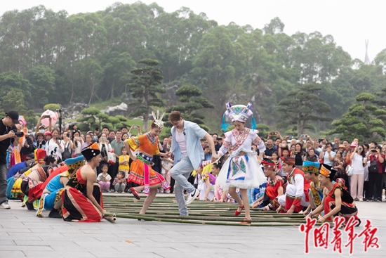 4月12日,南宁园博园“多彩三月三 民俗乐园博”系列活动现场,壮乡阿哥阿姐与外国友人共跳竹竿舞。吴欣宇/摄