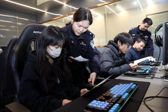 2024年2月,江苏省宿迁市公安局网安支队组织民警深入社区、街道、超市、网吧等地,普及网络安全知识,提升群众网络安全防范意识和防护技能,营造风清气正的网络环境。图为宿迁市宿城区一网吧内,宿迁市公安局网安支队民警向市民宣传网络安全知识。王力/视觉中国