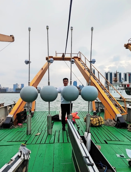 陈长霖课题组的学生正在海上进行浮标布放作业。