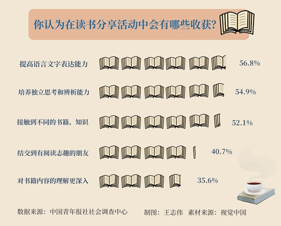分享读书笔记、寻找“读书搭子”、参加读书分享会……对不少人来说,阅读不仅是增长知识、提升思辨力的重要方式,也是认识社会、寻找志同道合者的渠道之一。世界读书日前夕,中国青年报社社会调查中心联合问卷网(wenjuan.com)发布的一项有1000名受访者参与的调查显示,54.6%的受访者参加过线上或线下的读书分享活动,提高语言文字表达能力、培养独立思考和辨析能力是受访者的主要收获。74.4%的受访者期待举办更多线上线下读书分享活动。
