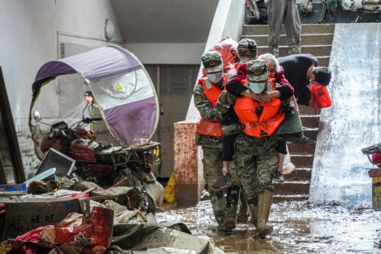 连日来,广东省大部普降暴雨到大暴雨。受强降雨影响,韶关市多地出现道路塌方、人员受困、通信供电中断等情况,韶关市武江区江湾镇发生多处山体滑坡,武警广东总队韶关支队派出300名官兵分两批紧急驰援。4月23日17时,20名武警官兵对江湾镇城区片区进行搜楼,转移受灾群众及物资。图为武警官兵在搜楼任务途中,一名年轻男子来求助,家里老人80多岁了,全身瘫痪无法转移。官兵蹚着厚厚的淤泥,将老人背出来转移。陈鹏丞/摄