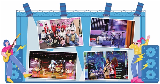 图①:今年寒假,团队在武汉保利上城社区开展为期一周的“VMV乐队寒假学堂”活动时,和社区的孩子合影。图②:VMV乐队登台演出。图③:贝斯手郭斌。图④:吉他手金海心。受访者供图