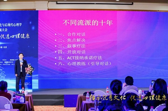 中国科学院心理研究所青少年人格与健康促进中心主任史占彪教授在报告中回顾了后现代心理学在中国应用10年的历程,介绍了合作对话、焦点解决、叙事疗法、开放对话、ACT、心理教练这六个后现代心理学流派在中国的发展和本土化的历程。主办方供图