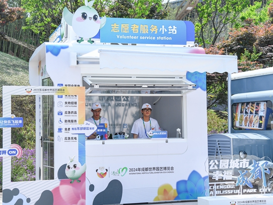 这是4月27日在成都世园会主会场拍摄的志愿者服务小站。4月26日,2024年成都世界园艺博览会开幕。来自川内高校和在地央企国企的1000余名“小青椒”志愿者陆续上岗,在成都世园会主会场重点区域开展引导、问询、翻译等志愿服务,为成都世园会增添一抹“志愿绿”。新华社记者 王曦/摄