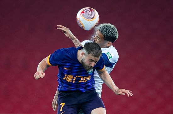 4月26日,天津津门虎队球员阿代米(前)与武汉三镇队球员恩里克在比赛中争顶。新华社记者 肖艺九/摄