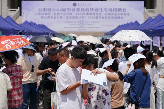 4月24日,昆明,求职的学生查看企业信息。当日,云南省2024届农业类高校毕业生专场招聘会、云南共青团“百校千企万岗”2024年春季双选会暨“宏志助航计划”毕业生专场招聘会在位于昆明市的云南农业大学西校区举行。据了解,此次招聘会有208家农业及相关用人单位进校招聘,提供岗位4256个,拟招聘人数10052名。视觉中国供图