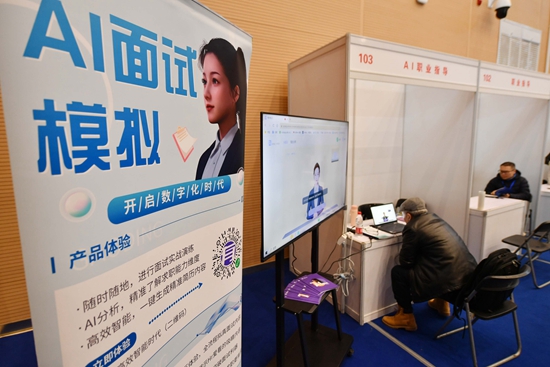2024年3月1日,北京信息科技大学举办的招聘活动上,现场设置的AI面试展位。视觉中国供图
