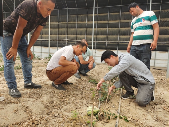 新疆昆玉红枣科技小院的硕士研究生孙武(右二)教村民栽培技术。受访者供图