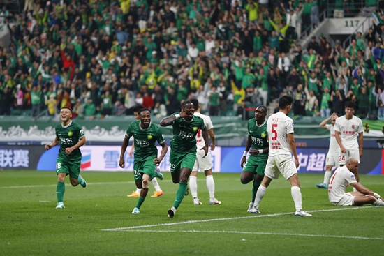 5月5日,北京国安队球员法比奥(前左三)进球后和队友庆祝。新华社记者 胡星宇/摄