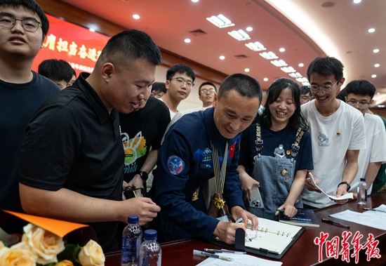 5月8日,西北工业大学“青春为中国式现代化挺膺担当”主题团日活动结束后,学生请解放军航天员大队航天员朱杨柱合影、签名。5月7日至15日,16名军地青年典型奔赴陕西、山西等地,与青年官兵和高校学子共话强国强军使命担当。中青报·中青网记者 李峥苨/摄