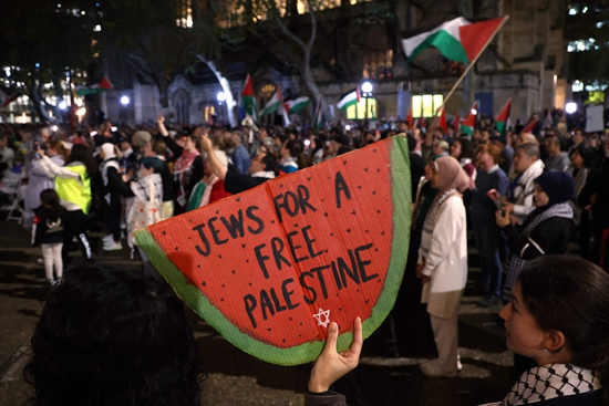 5月15日,澳大利亚悉尼,声援巴勒斯坦的示威者在纪念巴勒斯坦第76个“灾难日”的集会上举着标语牌和巴勒斯坦国旗。视觉中国供图