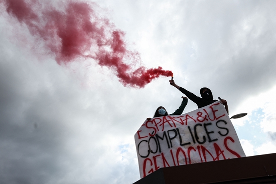 5月14日,西班牙马德里,康普顿斯大学校园内,两名抗议者点燃照明弹,举着写有“西班牙和欧盟是种族灭绝的帮凶”的横幅,要求结束加沙的流血冲突。