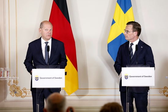 5月13日,瑞典斯德哥尔摩,德国总理朔尔茨(左)和瑞典首相克里斯特松在联合新闻发布会上表示反对对华加征关税。视觉中国供图